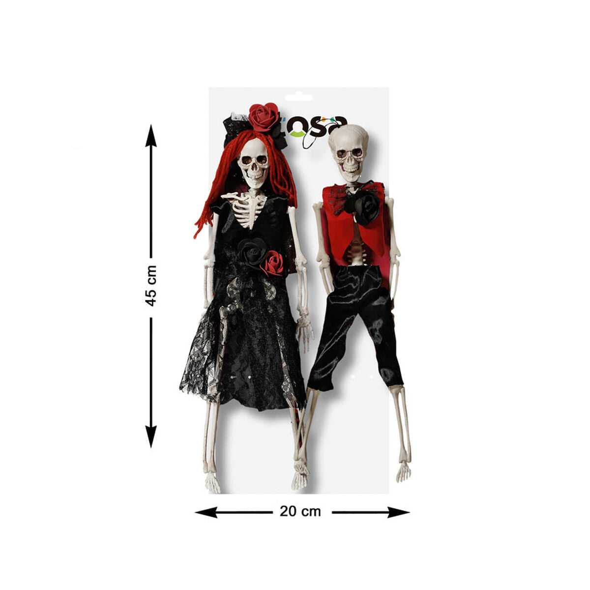 Sluta larva dig med tråkiga spindelnät – det är dags att ta ditt halloweendekor till nästa nivå! Kolla in detta dödssnygga skelettpar, redo för den eviga dansen! Hon i sin spetsiga svarta klänning med eldrött hår och röda rosor, och han i röd väst och svarta byxor. De ser ut som de är på väg till ett romantiskt (men benhårt) bröllop. Dessa två kommer garanterat dra blickar till sig när du kör ditt halloween-tema. Glöm inte att de är perfekta för att liva upp ett mörkt hörn!